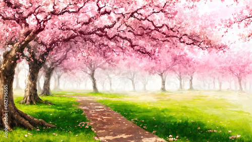 © Cobalt, Fototapeta premium Spring landscape with blooming cherry trees, sakura tree, stylized oil on canvas, forest in sunny day.