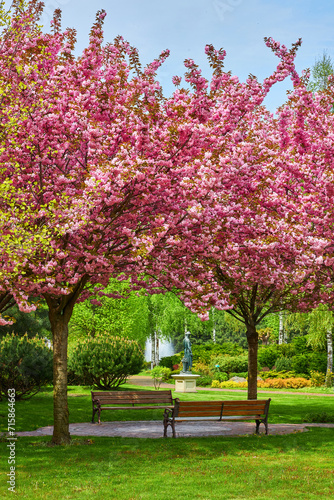 © Ryzhkov Oleksandr, Naklejka premium spring landscape with blooming sakura trees in the park