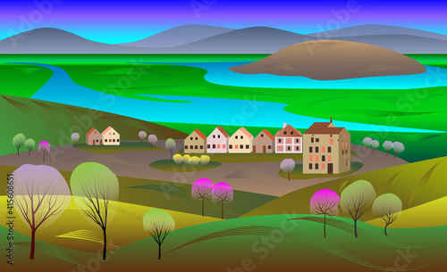 © Eleonora, Fototapeta premium Spring landscape with blossoming trees, valley, river, houses, green hills, mountains. Vector illustration.