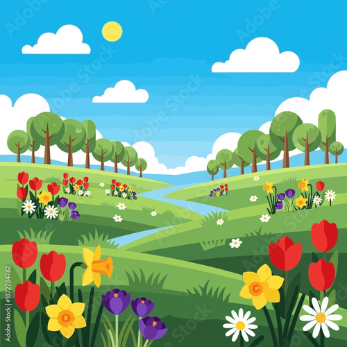 Obraz premium Spring landscape with colorful flowers and rolling green hills