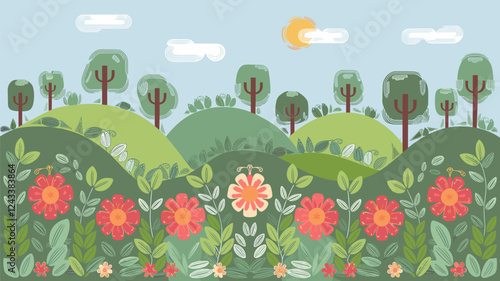 © PixeloAI, Fototapeta premium Spring Landscape with Flowers and Trees
