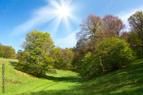 © Sunny Forest, Fototapeta premium Spring landscape with green grass and trees and blue sky