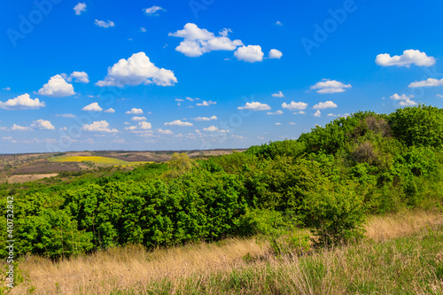 © olyasolodenko, Naklejka premium Spring landscape with green trees, meadows, fields and blue sky