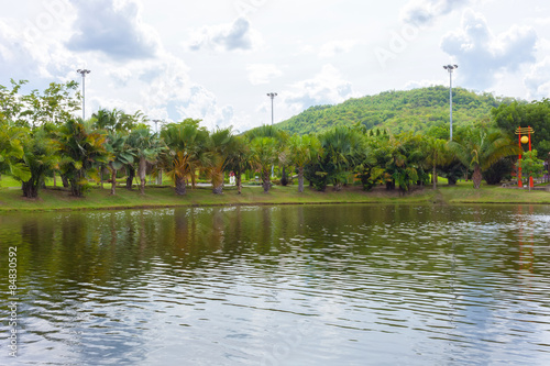 © nopparats, Obraz premium Spring landscape with lake and single chair