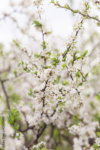 Fototapeta premium Spring light background with blooming trees. Branches with white flowers....