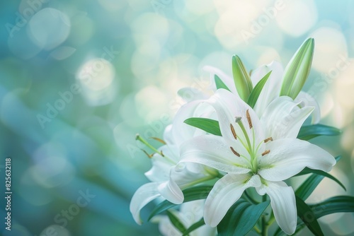 © Serhii, Fototapeta premium Spring Lilies. Easter Bouquet of White Lilies with Green Leaves on Nature Background