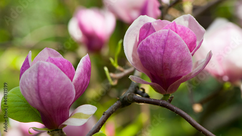 © Oleksandr Filatov, Obraz premium spring magnolia flowers, natural abstract soft floral background. beautiful flowers, delicate magnolia, in the garden or park. pink flower on green natural background. close-up