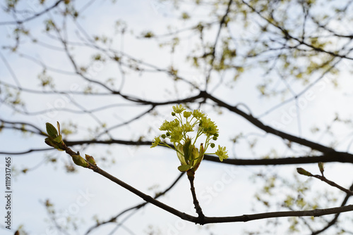 Fototapeta premium Spring maple blossom in the city park in spring.