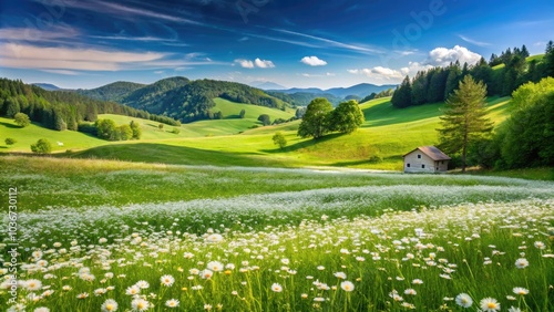 © Caitlin, Obraz premium Spring Meadow Bliss: Architectural Photography of a Serene Landscape with White Wildflowers, Lush Greenery, and Gentle Hills, Perfect for Nature Lovers and Outdoor Enthusiasts