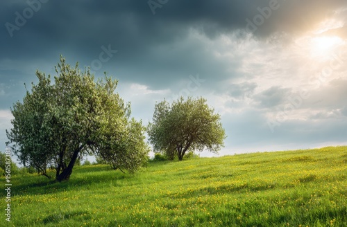 Obraz premium Spring meadow, dramatic sky, sun peeks through clouds
