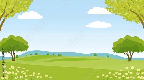 Fototapeta premium Spring Meadow Landscape Green Hills Trees Daisies Blue Sky