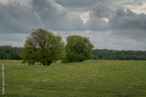 © Тамара Андреева, Obraz premium Spring meadow with dandelion flowers and green grass and rare trees.