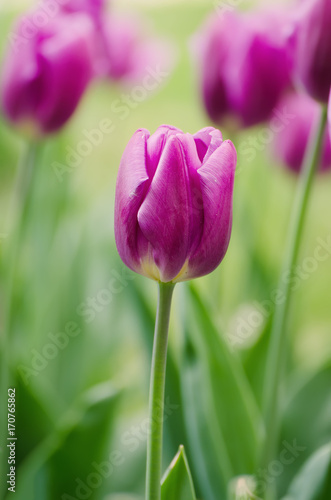 Fototapeta premium Spring meadow with violet tulip flowers, floral natural seasonal easter...