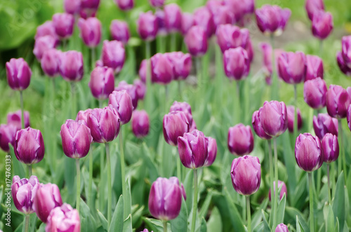 Fototapeta premium Spring meadow with violet tulip flowers, floral natural seasonal easter...
