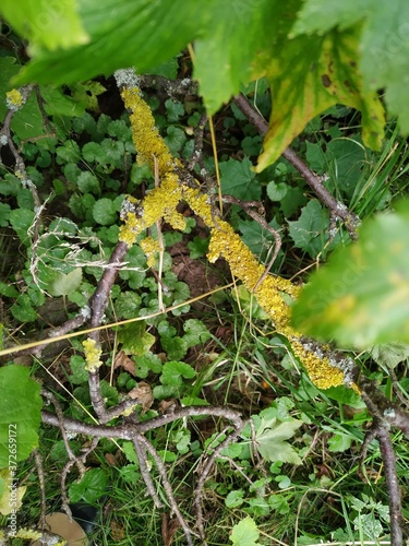 Naklejka premium Spring mossy tree branch view. Branch moss view. Mossy branch macro view.