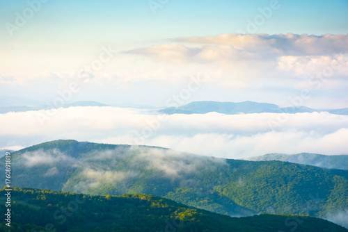 © Pellinni, Obraz premium spring mountain landscape of ukraine with fog in valley and clouds on blue sky in morning light. dramatic atmosphere phenomenon view from the top. evaporating forest on the hills of carpathians