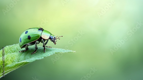 Naklejka premium Spring nature action green ladybug on flora leaf macro close-up view vibrant environment