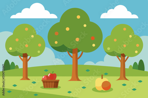 © Sharati, Fototapeta premium Spring nature landscape with a tree, flowers, and grass under a sunny sky
