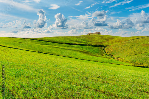 Fototapeta premium spring or summer nature farm landscape with green salad grassland hills and beautiful cloudy ske on baclground. Farming landscape in spring or summer field