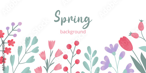 © Katrinka8888, Naklejka premium Spring or summer rectangular botanical template in flat vector style. Hand drawn colorful different grainy textured flowers and green leaves.