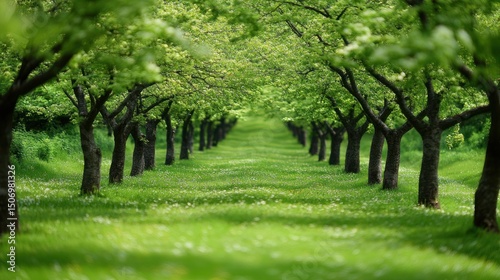 © STwul, Obraz premium Spring orchard trees rows green grass nature background