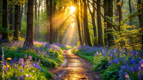© Arnada, Obraz premium Spring Path Walk: Macro Photography of Blossoming Flowers and Delicate Greenery