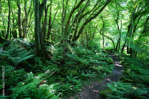 Fototapeta premium spring pathway through mossy rocks and old trees