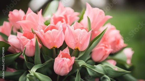 © Narongsag, Fototapeta premium Spring Pink Tulips Bouquet Soft Pastel Flowers Floral Arrangement Flatlay Copy Space