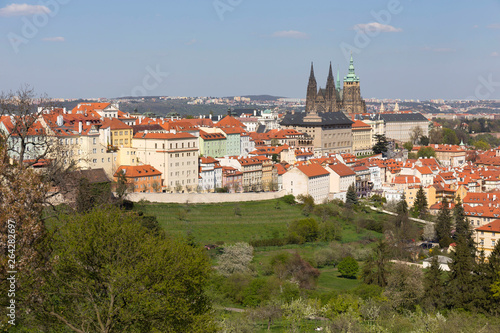 © Kajano, Fototapeta premium Spring Prague City with gothic Castle and the green Nature and flowering Trees, Czech Republic
