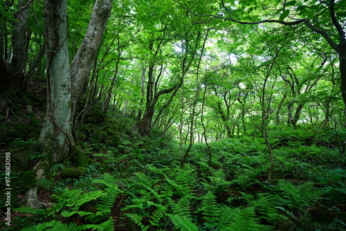 © SooHyun, Obraz premium spring primeval forest with thick ferns and mossy old trees