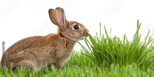 Fototapeta premium Spring Rabbit Photo: Brown Bunny, One Ear Down, Green Grass, Sniffing -...