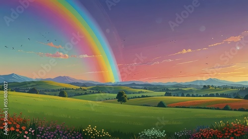 © Gilang, Naklejka premium Spring Rainbow Illustration With Blossoms and Pastel Hill View