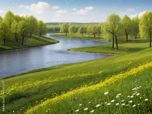 © Ihor Voron, Obraz premium Spring river among fields with blooming dandelions