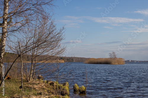 © berendoska, Obraz premium Spring river landscape. On the shore - birches and trees without leaves on the background of blue sky and white clouds. In the foreground is a river. Russia