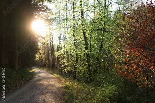 Fototapeta premium spring road in the forest, illuminated by the bright sun, the concept of...
