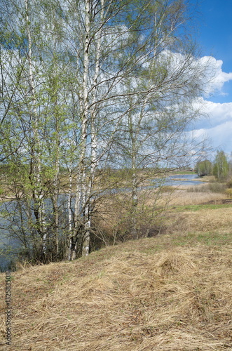 Fototapeta premium Spring rural landscape with birch trees on the banks of the river