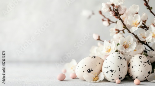 Fototapeta premium Spring's gentle arrival: delicate blossoms and speckled Easter eggs.