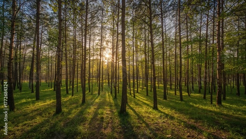 Obraz premium Spring scenery featuring a pine woodland and lush greenery