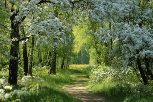 © LimeSky, Fototapeta premium Spring scenery featuring flowering bird cherry near Pruzhany Brest region Belarus