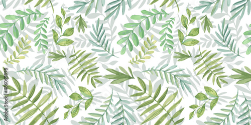 © Andrei, Naklejka premium Spring Seamless Pattern. Floral elements in doodle style. White background. Watercolor tropical green leaves. Wedding Patterns with leaf