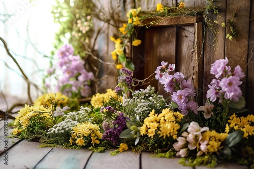 © Francesco, Fototapeta premium spring set up with colourful flowers pink , vintage wood parquet.