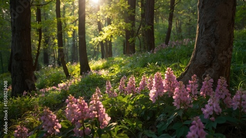 Obraz premium Spring sunlight through forest trees over blooming wildflowers