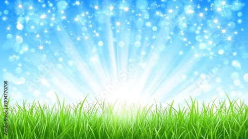 Obraz premium Spring sunrise, grassy field, sparkly sky, bokeh background, website banner