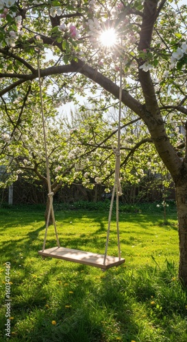 © Subu.STD, Obraz premium Spring swing in blossoming orchard