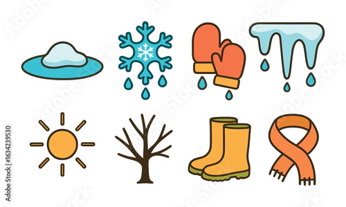 © Степан Озарчук, Fototapeta premium Spring Thaw Icons. Flat vector mini-illustrations snow turning into water in colors children's illustrations: