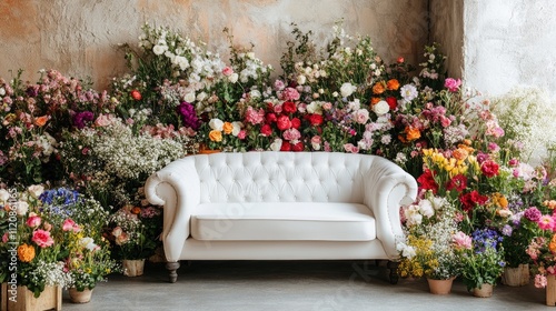 Obraz premium Spring-themed living room featuring a classic white sofa adorned with a vibrant array of colorful flowers creating a charming photo backdrop.