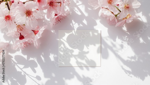 Naklejka premium Spring-themed wedding stock image with feminine desktop setup. Blooming pink cherry blossom branch. Blank invitation card mockup in natural sunlight. White dappled wooden surface background.