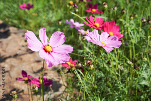 Fototapeta premium spring time, beautiful cosmos flowers are blossoming on green meadow against...