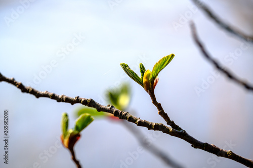 © Martins Vanags, Fototapeta premium spring tree branches with small fresh leaves over water body background with reflections