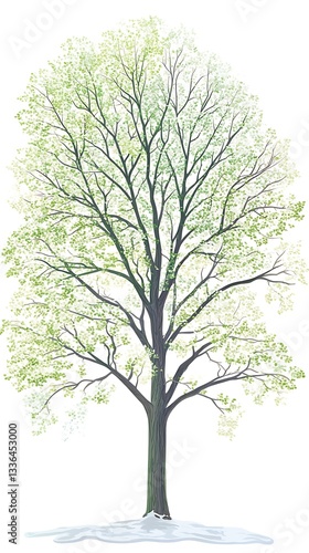 © Asrianto, Obraz premium Spring tree illustration, isolated, snow at base, nature art, background image, graphic design